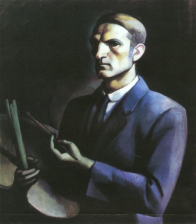 Szinte önálló témaként tárgyalhatók életének különböző szakaszaiban készült önarcképei. Közülük egyik korai az Önarckép palettával. A sötét, szürke-fekete háttérből egy tömbből kifaragva jelenik meg a festő félalakos, háromnegyed profilból ábrázolt portréja. A kék kabátos figura kezében tartja a palettát és az ecseteket – a szakma attribitumait -, és szigorú tekintettel néz a szemlélőre. A kemény pillantás, az erős áll, a markáns orr és az orrtól lefutó, kihangsúlyozott ránc a meg nem alkuvó ember ismertetőjegyei.