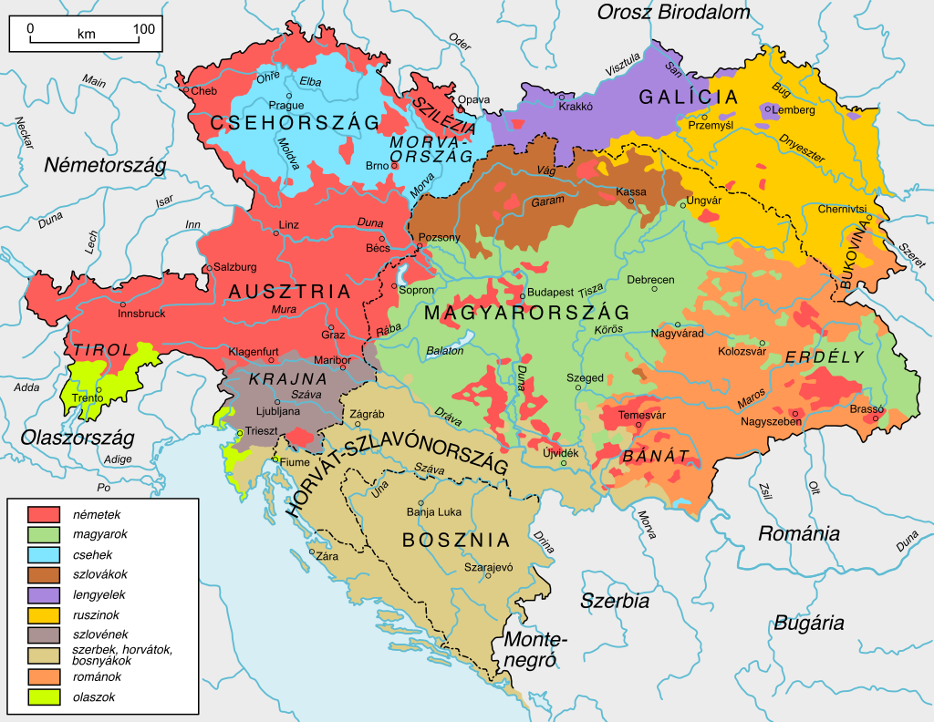 Nemzetiségek eloszlása az Osztrák–Magyar Monarchia területén. Forrás: William R. Shepherd: Historical Atlas (1911)