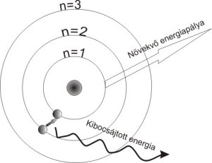 2. Az elektron csak meghatározott nagyságú energiát vehet fel, csakis akkorát, hogy azzal egy másik, magasabb energiájú pályára jusson. A gerjesztett állapotú atom energiát sugároz ki, ami után ismét alapállapotba kerül. A kisugárzott energia nagysága azonos a gerjesztés során felvettével. Ebből következik, hogy minden pályához csak egy adott energiaszint tartozhat.”