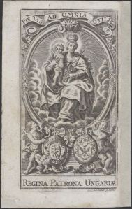 törvénycikk nem említi az oltalmazó Nagyasszony nevét. […] A Regnum Marianum barokk világában a Napbaöltözött Asszony ábrázolásából bontakozik ki a Patrona Hungariae jellegzetes, máig érvényes ikonográfiája, amelyen a Szűzanya fejére a tizenkét csillagú korona helyett a Magyar Szent Korona, a karján ülő kis Jézus helyébe az ország almája, Mária másik kezébe pedig az ország jogara, kormánypálcája kerül. A lábánál feltűnő félhold a török veszedelem elmúltával bőségszaruvá, mintegy a magyar Kánaán, az extra Hungariam non est vita jelképévé alakult. Ez a barokkos Mária-ábrázolás képekről, szobrokról, céhzászlókról, pénzekről, később postabélyegekről közismertté válik. Pázmány Péter egyik prédikációjában mondja: mái napig költő pénzünkön a Boldogasszony képe körül ama szokott bötűkkel, Patrona Hungariae, Magyarország Asszonyának valljuk a Szent Szüzet.
