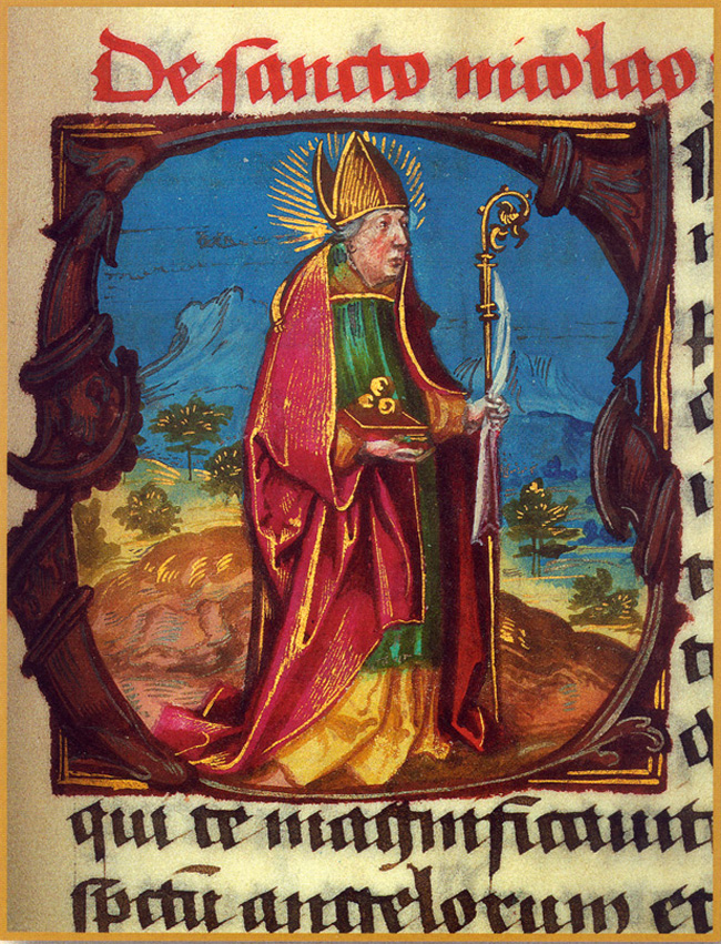 Myrai avagy Barii Szent Miklós (december 6.) a keleti egyház egyik fő szentje, a gyermekek Mikulása, Télapója, Karácsony Apója. Ma minden bizonnyal ő a legnépszerűbb, legismertebb szent az egész világon. Ugyanakkor Szent Miklósnak, a kis-ázsiai (lükiai) Myra püspökének (†350 körül) igaz arcát a Mikulás vattaszakálla eltakarja, azonosítását a köréje nőtt legendabokrok lehetetlenné teszik. Így aztán 1968-ban ő is a naptárból száműzendő szentek listájára került, hallatlan közkedveltségének köszönhetően azonban helyi tiszteletét megengedte az egyház.